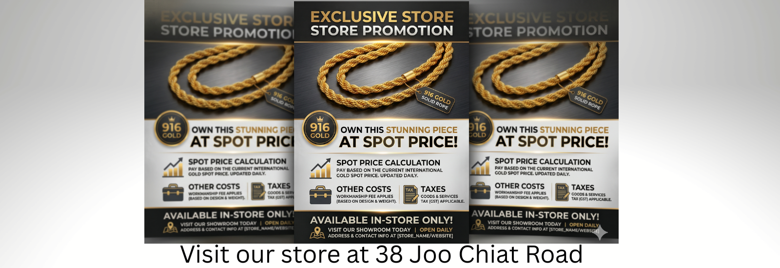 We specialize in authentic 916 and 999 gold jewelry with a wide selection of bracelets, necklaces, rings, and more — all crafted to shine with timeless beauty.